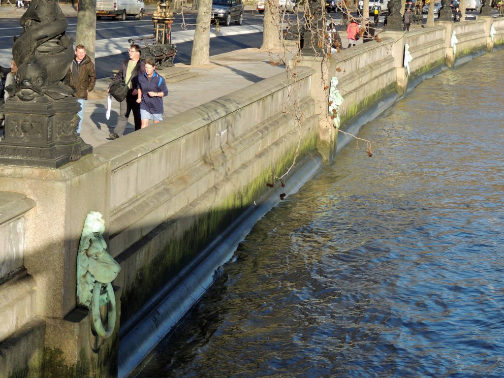 What was needed was a form of early warning system if the waters were rising to danger levels. The answer to the problem was not only simple but cheap as well. If you look over the Embankment walls today, you can still see what was done. Every few metres there is a mooring point for boats set into the wall. They are in the shape of a lion’s head with the mooring ring extending from its mouth. Mooring points and a river; that all makes sense until you realise they are set at a height which makes them useless as mooring points.