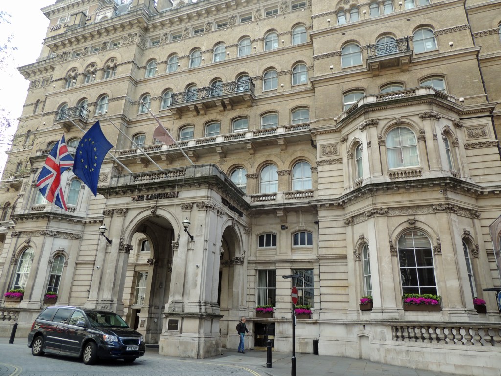 The Langham Hotel is an imposing building at 1 Portland Place opposite BBC Broadcasting House off Regent Street just north of Oxford Circus. It was designed by John Giles and completed in 1865. At its completion it was heralded as the most modern hotel in London and had many innovations fitted such as modern bathrooms and the first hydraulic lift.
